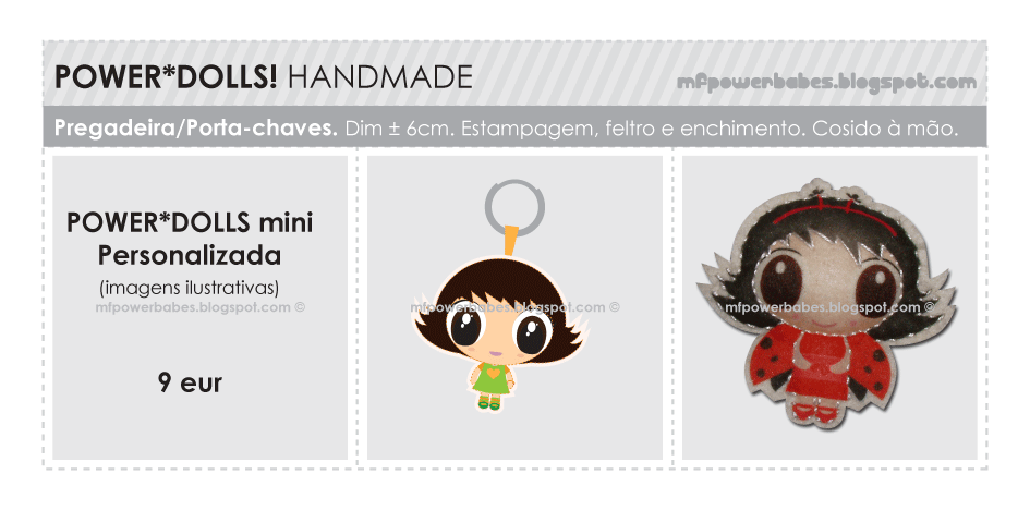 Leve a sua ilustração a uma outra dimensão, transformando-a numa Power*Doll! Como pregadeira, porta-chaves, magnética ou para pendurar, a escolha é sua!